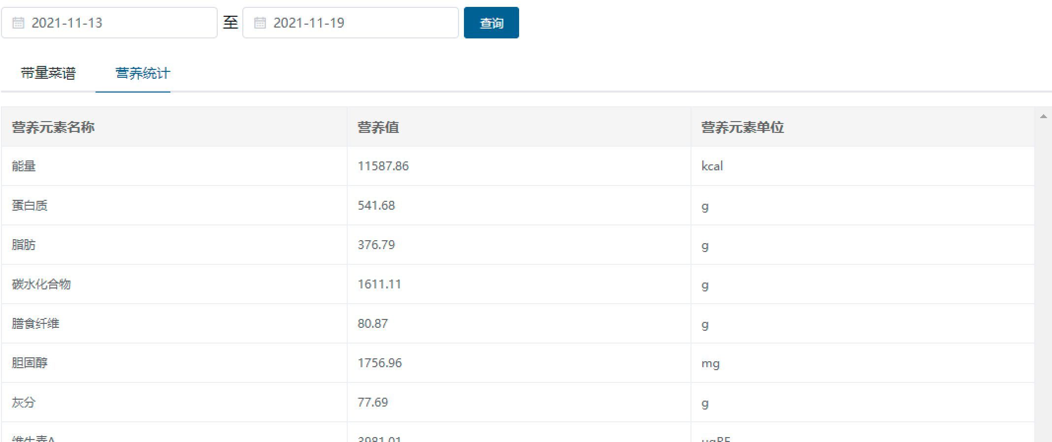 通過系統模型,自動計算出每日菜品所含的十幾種營養元素含量,主要包括礦物質和維生素等。微量營養素雖然需要量少,但在幼兒園、中小學生成長過程中發揮著重要的作用,缺乏或過量都會引起疾病,所以膳食搭配中易不可忽視。