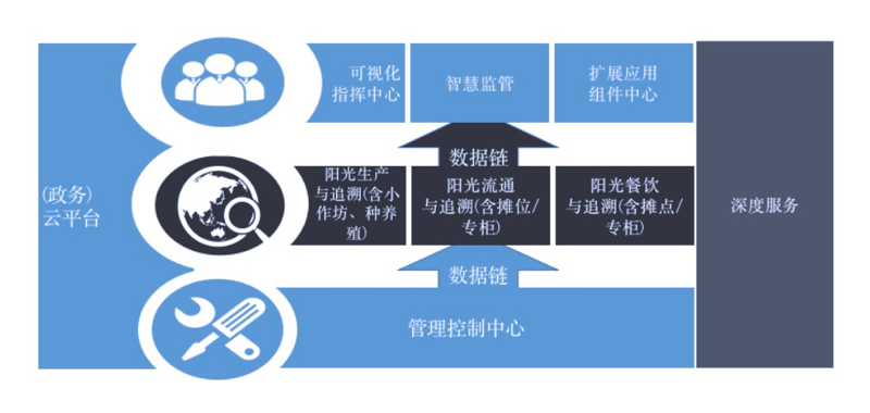 可視化面向監管人員?各級監管部門管理人員?通過監管工作臺?應用區塊鏈技術?實現數據統計?跟蹤、預警、溯源監管等工作任務。常態化面向一線監管?一線監管執法人員?利用系統功能以及手機移動端應用?快捷跟蹤、查詢食品流向?記錄日常監管工作?完成日常工作任務。